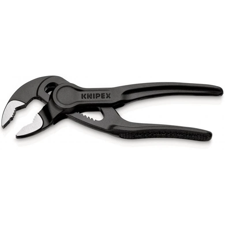 Small, useful and anything but a toy! The Cobra XS is a new, compact member of the KNIPEX Cobra family. It is a fully functional pair of high-tech water pump pliers that really comes into its own in tight spaces. With fine adjustment directly on the workpiece, this tool provides eleven adjustment positions and can grip nuts up to 24 mm in diameter and other workpieces as large as 28 mm Ð at an overall length of only 100 millimetres. Owing to its compact size, the Cobra XS can be easily used with only one hand. Like all products in the KNIPEX Cobra family, the Cobra XS is of course self-locking on pipes and nuts: The result is no slipping at the workpiece and operations such as gripping, holding, pressing and bending are considerably less strenuous.