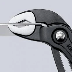 For pipes, nuts, sleeves, for various kinds of components: the professional user applies the Knipex Cobra quickly and accurately with just one hand movement. The spring-loaded hinge bolt locks securely into place without adjusting inadvertently. Thanks to the 25-fold fine adjustment, the Cobra can be ideally adjusted to different sizes of the component. This fine adjustment also makes sure that the distance to the handles remains hand-friendly for every grip width.